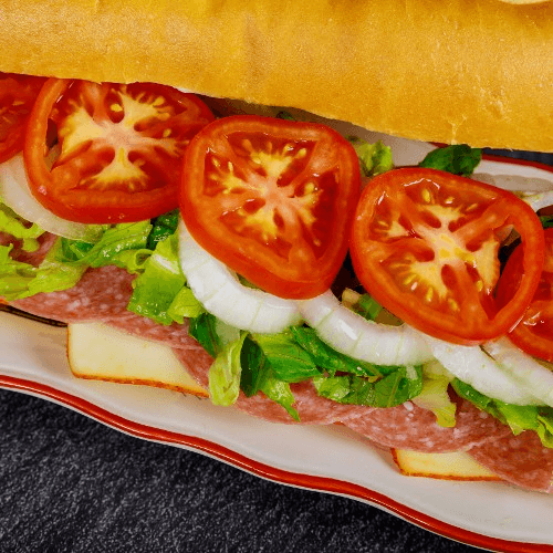 Salami, ham, cheese, Italian dressing, and hot peppers