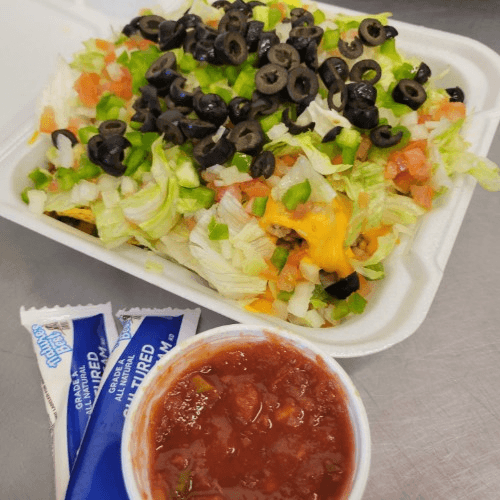 Chips, cheese, seasoned ground beef, refried beans, lettuce, tomatoes, onions, green peppers, black olives, sour cream, and salsa!