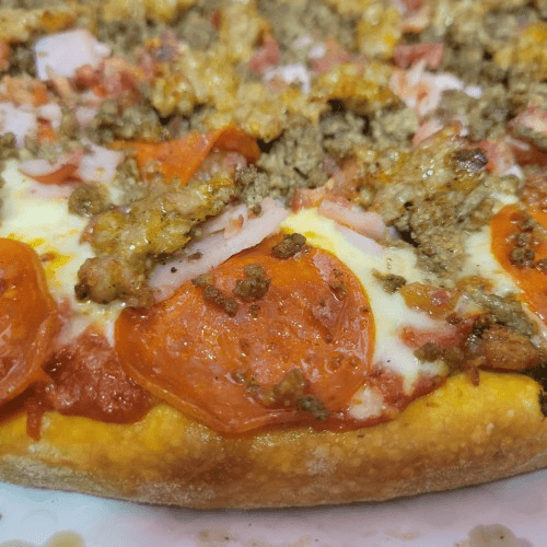 Pepperoni, sausage, mushrooms, onions, green peppers, and black olives